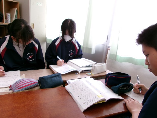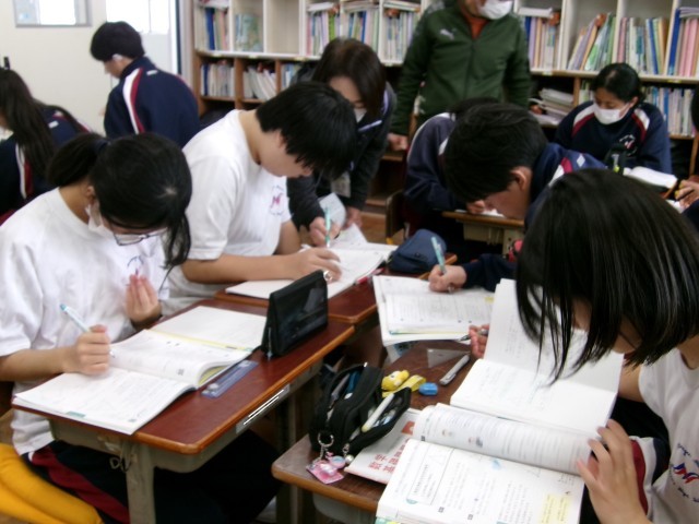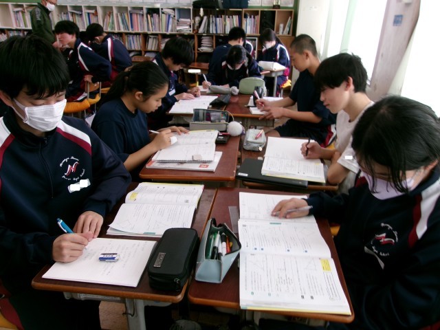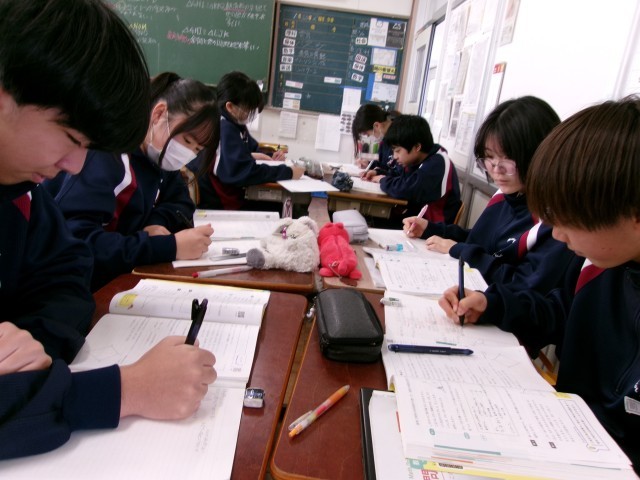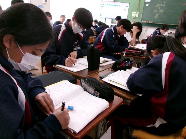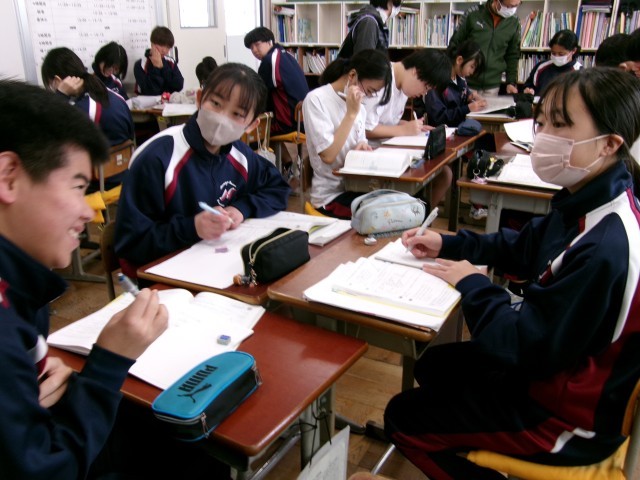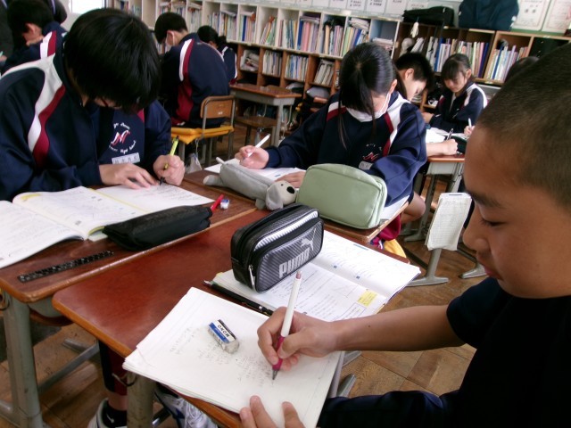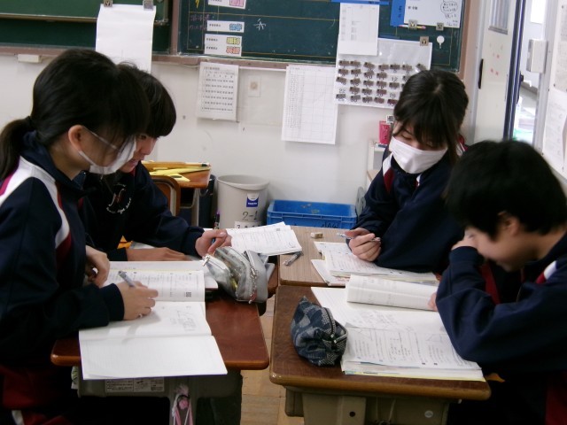 学習した直角三角形の合同条件を生かす問題に、グループに分かれてチャレンジしています。「できた」という元気のいい声が聞こえてきました。