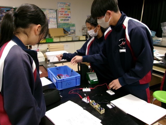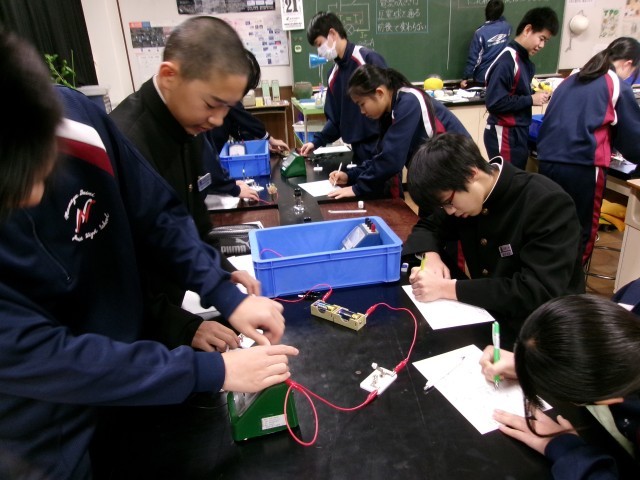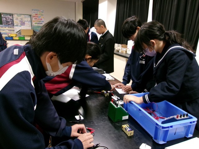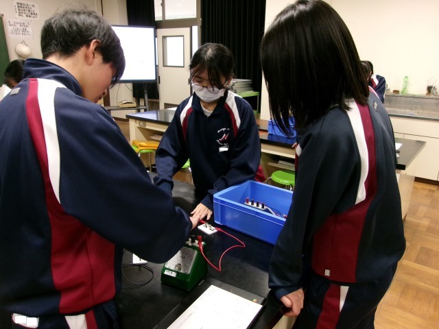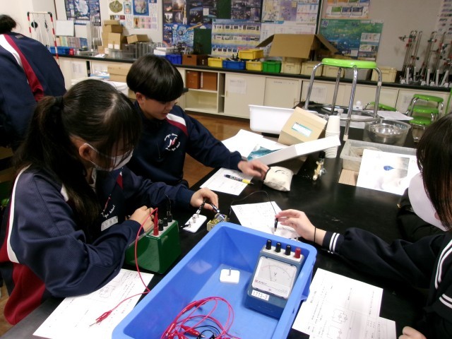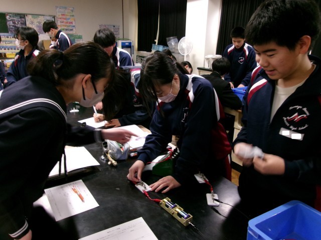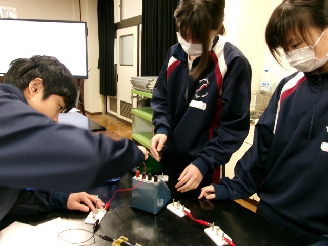 直列回路・並列回路を流れる電流の大きさをはかる実験を行っています。各グループ、協力して活動していました。