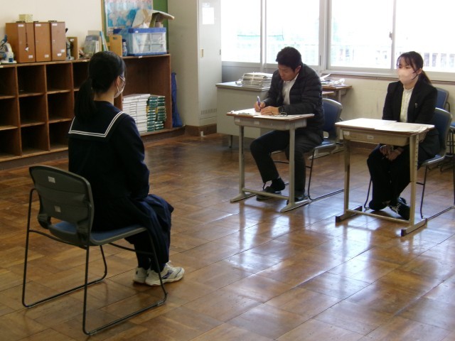 面接練習2日目のようすです。笑顔の人もいれば、泣き出しそうな人も…。いずれにしても自分の気持ちや考えを、素直に表現することができればと思います。入試本番まであとわずか、がんばれ3年生!
