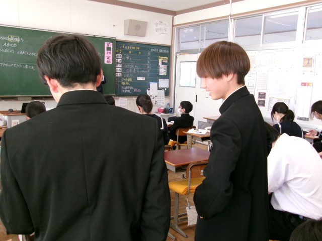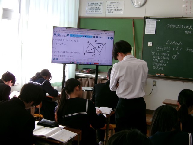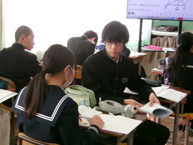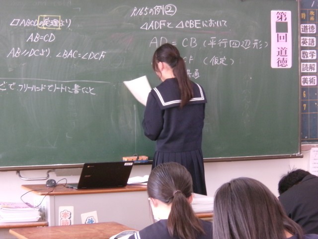 学習した平行四辺形の定義を利用して、図形の証明問題に取り組んでいます。友達と意見交換するなど、あきらめずに挑戦する姿勢が目立ちました。