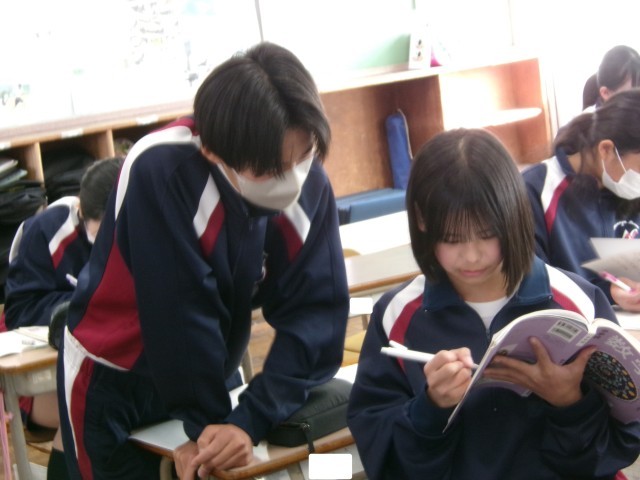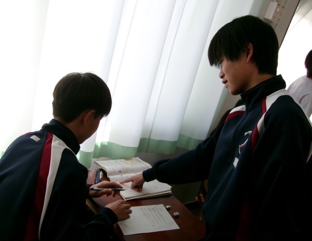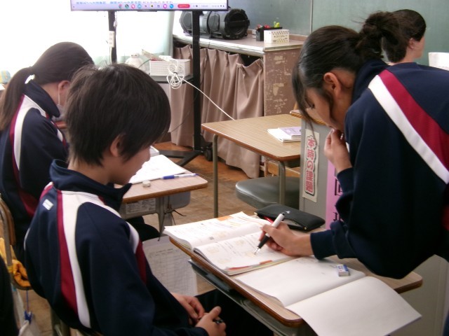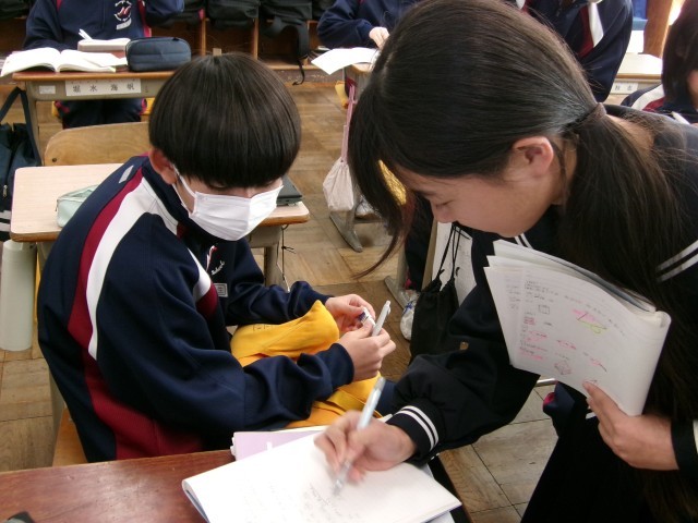 立体の表面積を求めていました。仲間のヒントやアドバイスを受けて「あぁ、そうか!」や「あ、わかった!」という声が数多く聞こえてきました。
