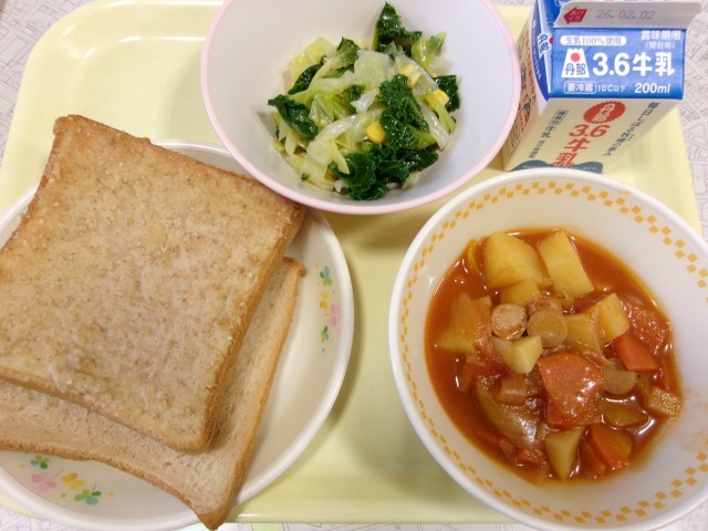 今日のメニューはセサミトースト、黒糖入りパン、牛乳、トマトシチュー、プチヴェールのサラダです。「ふるさと給食の日」ということで、プチヴェールの紹介動画が放送されました。
