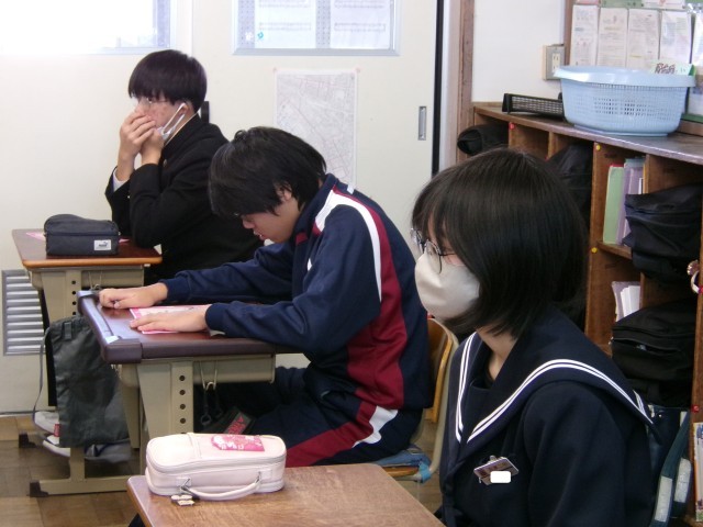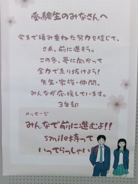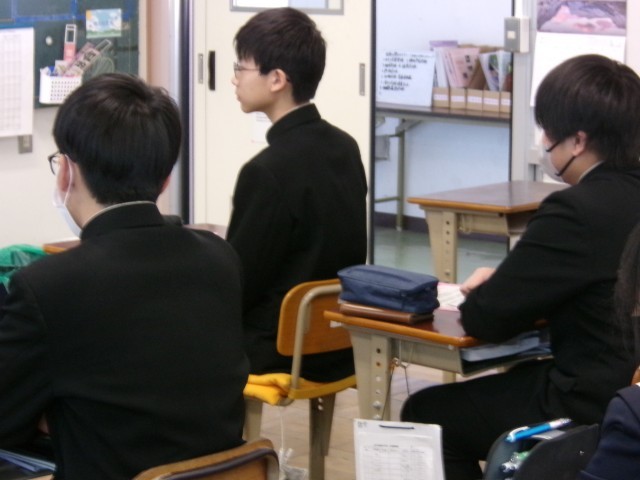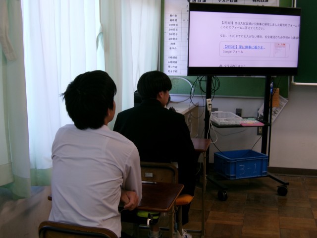 明日の私立高校入試に向け、担任の先生が励ましのお話をしているところです。持ち物や時間のチェックをして明日に備えてください。みなさんの健闘を祈っています。ガンバレ3年生!