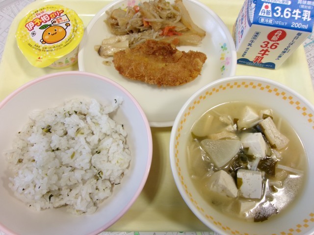 今日のメニューは、菜めし、牛乳、鱈のさくさくフライ、さつま揚げと野菜の炒め物、豆腐と大根のみそ汁、いよかんゼリーです。