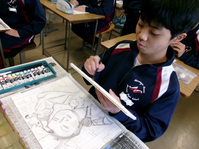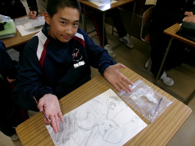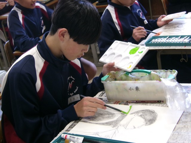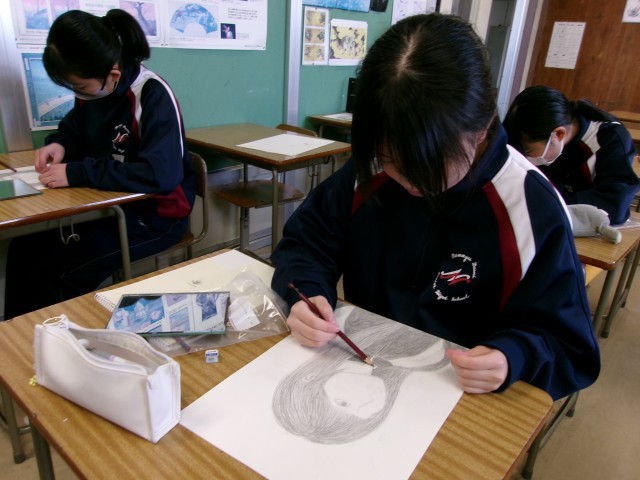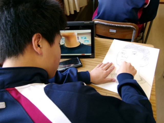 自画像の制作に取り組んでいます。自分の特徴をよくとらえ、丁寧に描いてました。仕上がりが楽しみです。