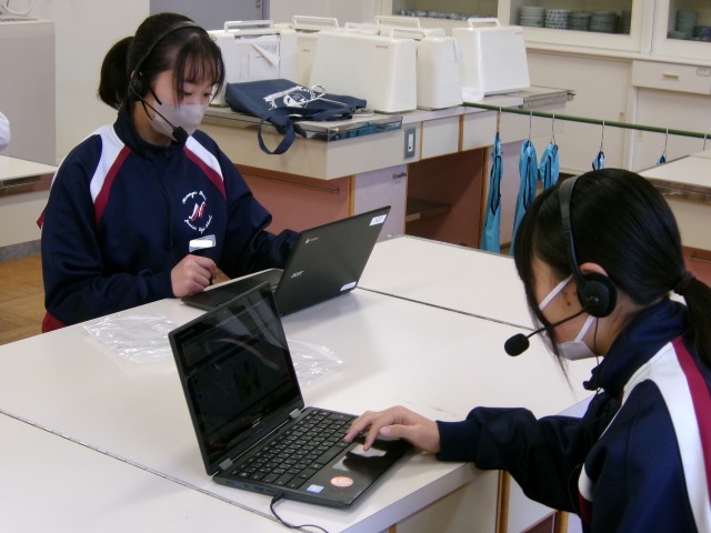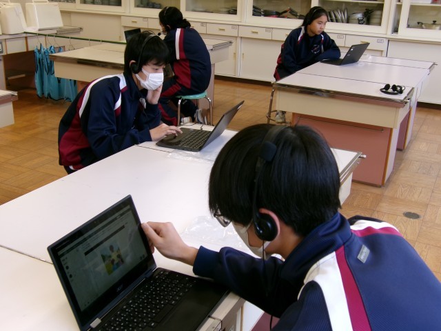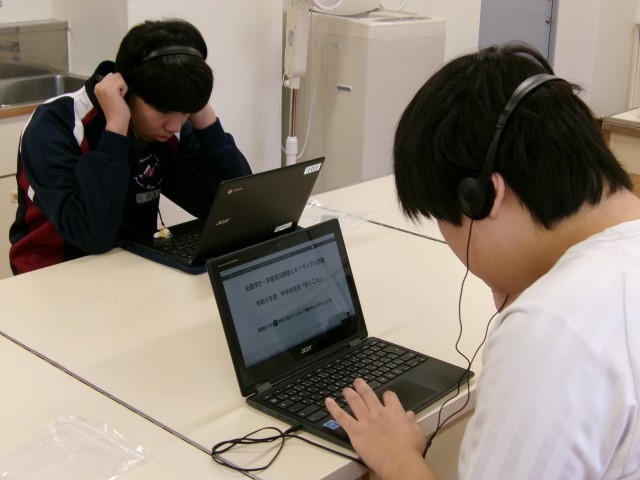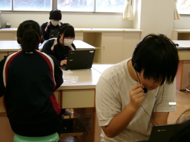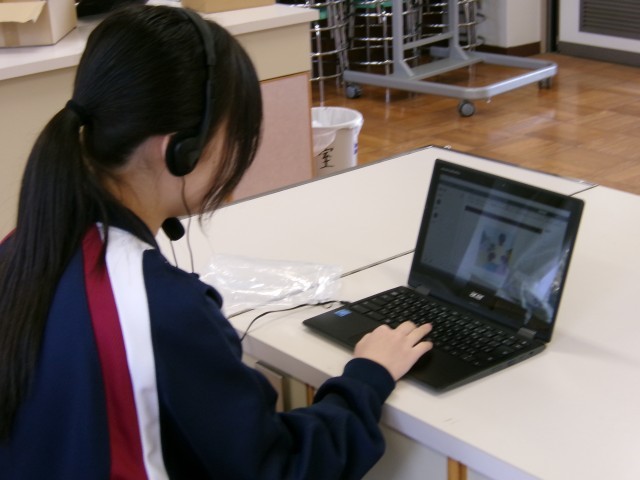3年生になって行う学力学習診断調査のプレテストを行っていました。ヘッドレストを付け、聞くテスト、話すテストの確認をしているところです。