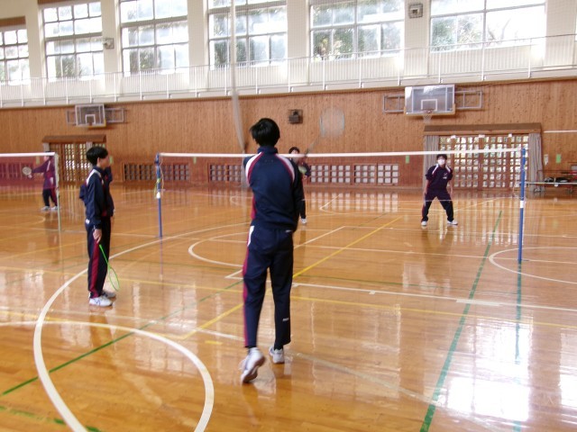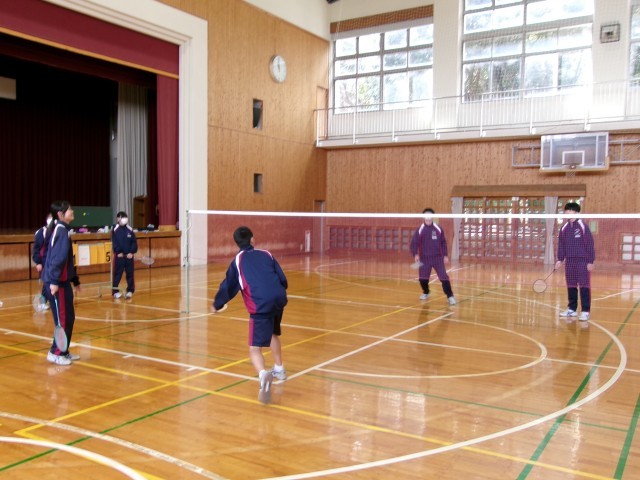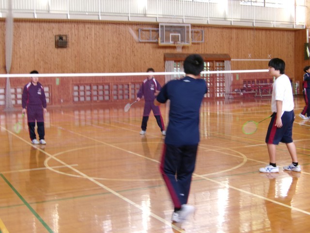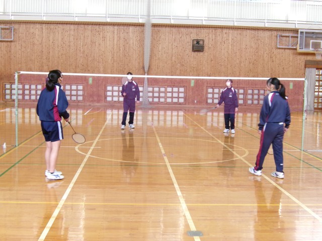 「バドミントン」ダブルスのゲームを楽しんでいるようすです。