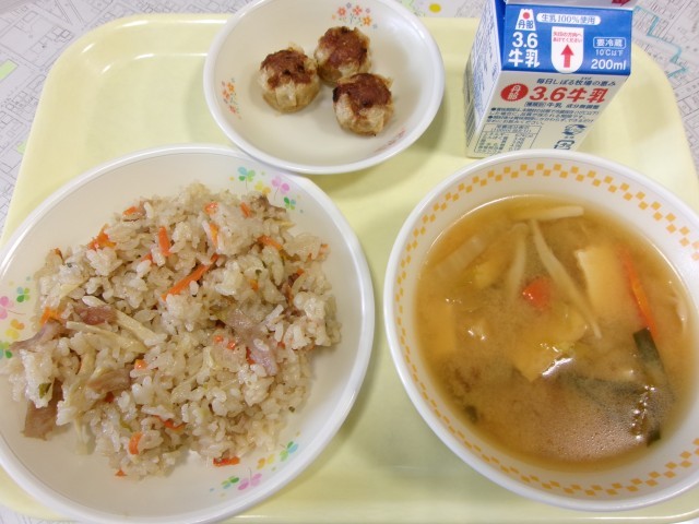 今日のメニューは、中華炊き込みごはん、牛乳、揚げ焼売、キムチスープです。
