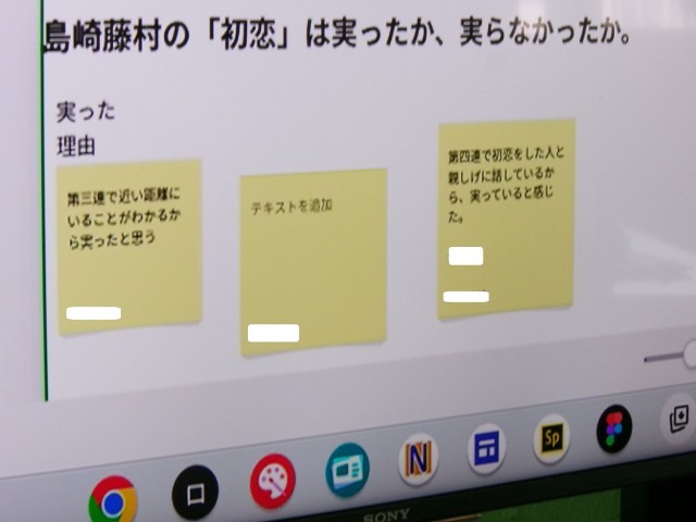 「島崎藤村の『初恋』は実ったか、実らなかったか、グループで意見交換しながら、個人の考えをまとめています。