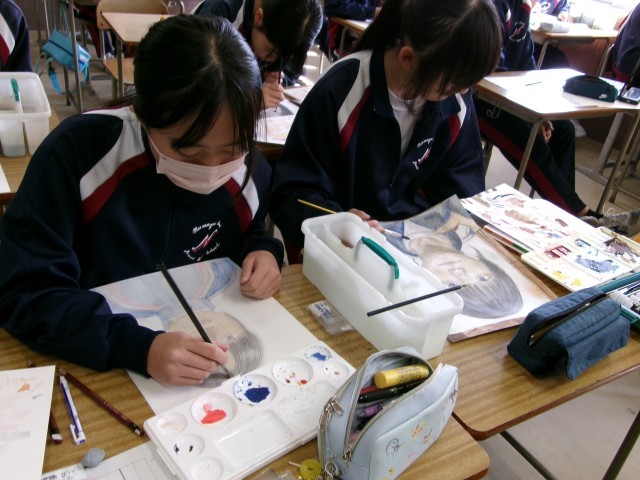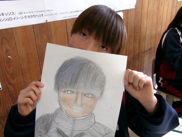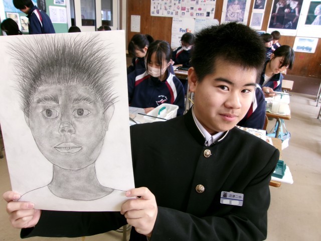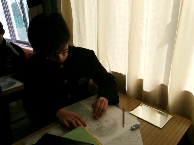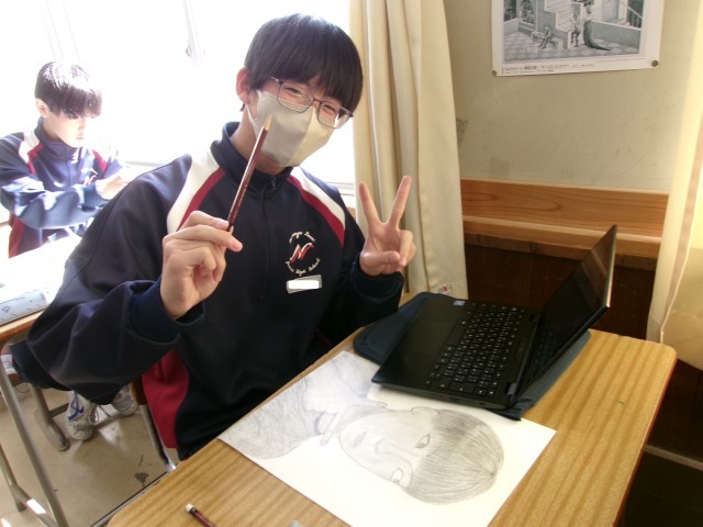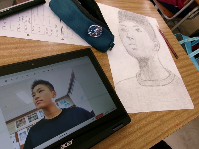 自画像の制作が進んでいます。濃淡や色をつけることで、作品の印象が変わってきたことがわかります。