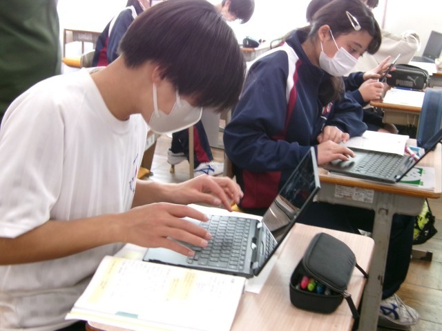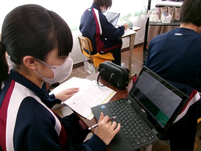 「データの活用」相対度数を求めています。ChromeBookの計算機を使いながらスラスラと解いていました。