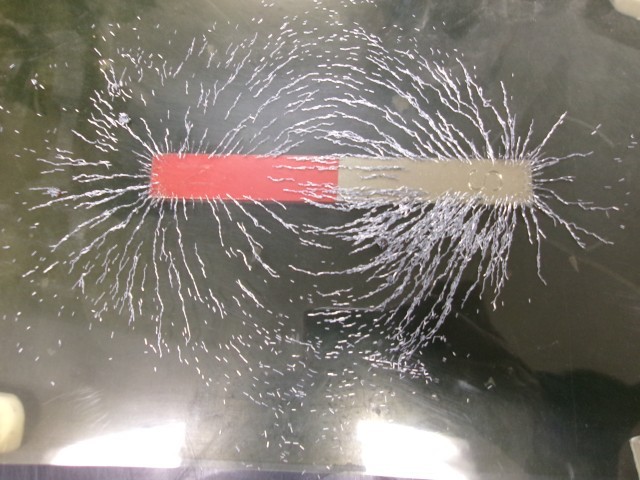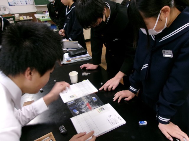 磁力・磁界・磁力線を学習した後、グループで磁石の磁力線の観察をしているようすです。