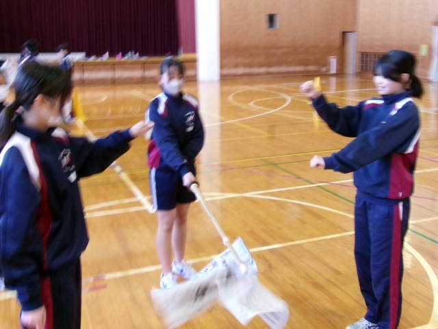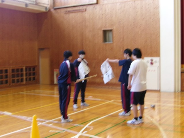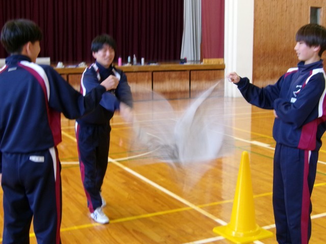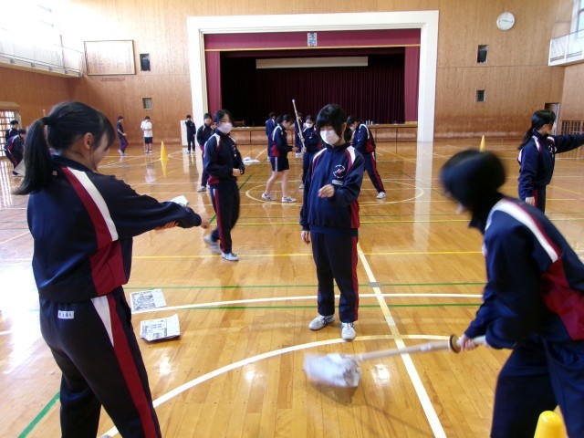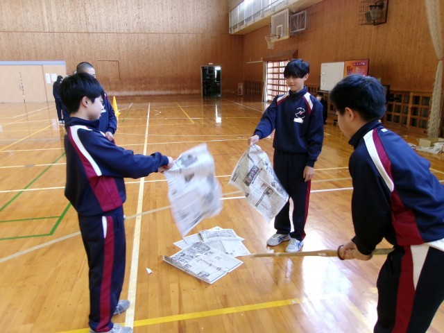 「剣道」竹刀の持ち方、足さばき、竹刀の振り方に注意し、仲間が持った新聞紙に面打ちして、上手に切れるかどうか確かめていました。