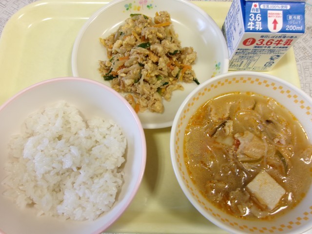 今日のメニューは、ごはん、牛乳、フーチャンプルー、豆腐チゲスープでした。