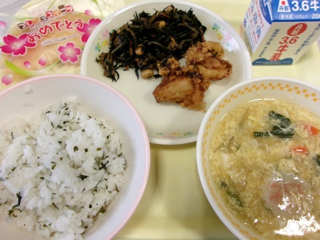 今日は卒業・修了お祝い献立です。メニューは、わかめごはん、牛乳、鶏肉の唐揚げ、ひじきと大豆の炒め煮、かきたま汁、お祝いデザートです。
