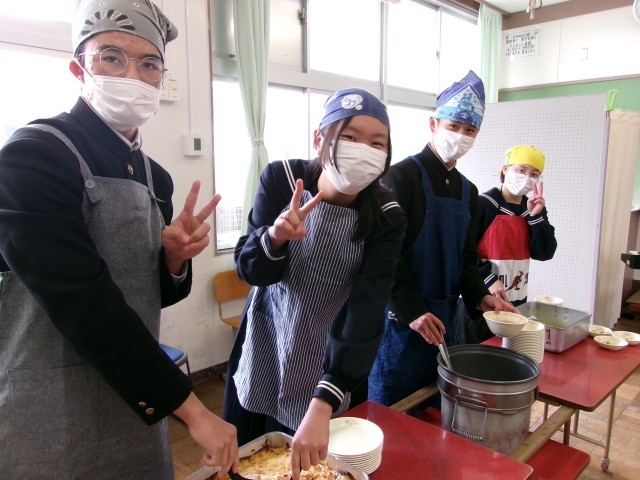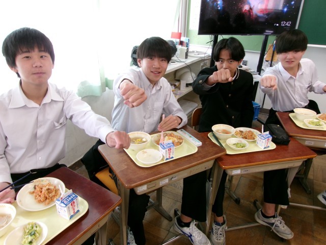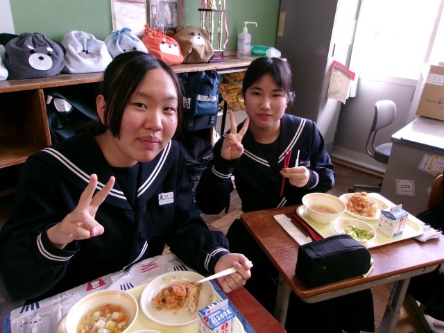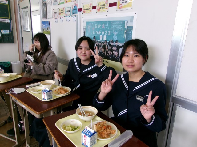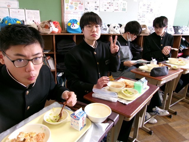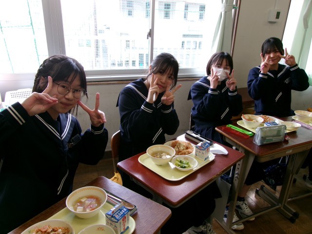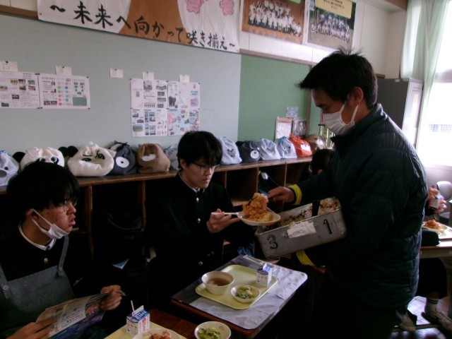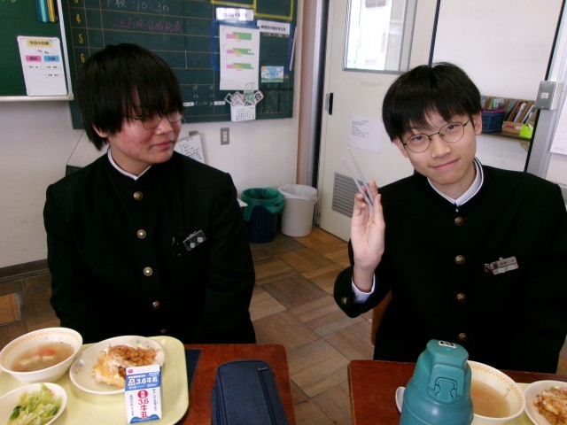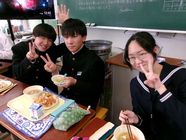 行事の関係で、3年生は本日が中学校最後の給食となりました。教室を訪ねると、輪になって楽しく食事をしているところでした。