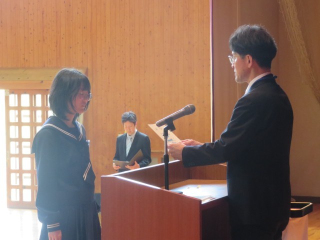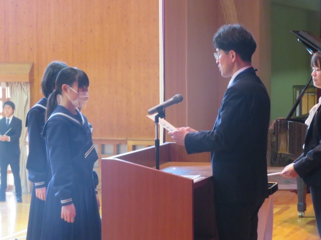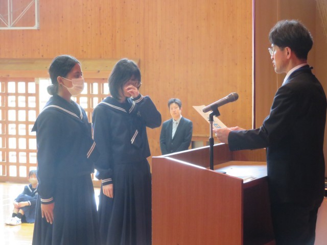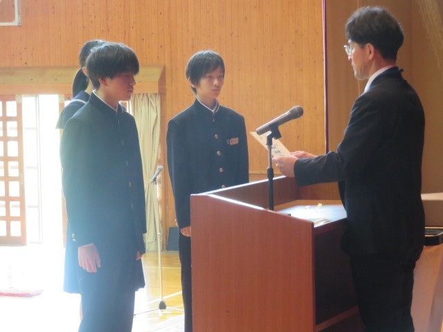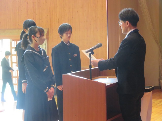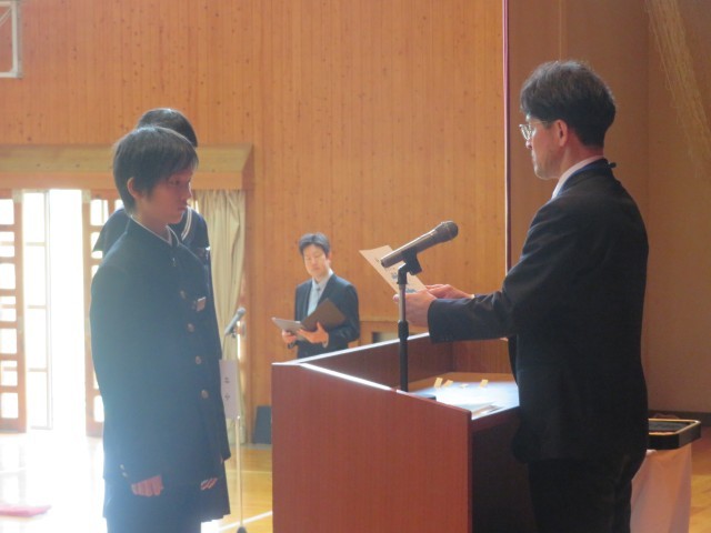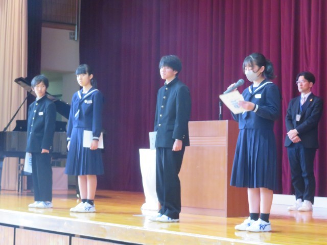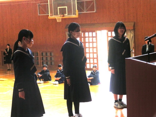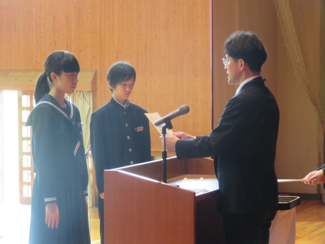 生徒会本部役員、専門委員長の任命のようすです。よりよい学校生活の実現を目指してがんばってください。