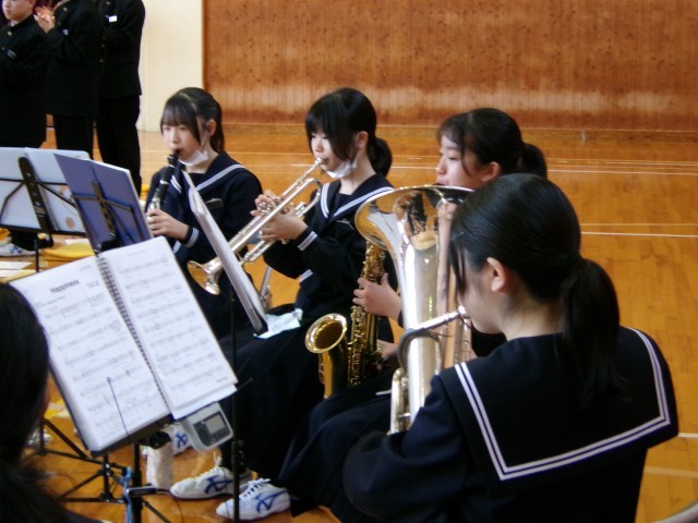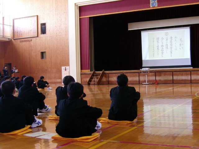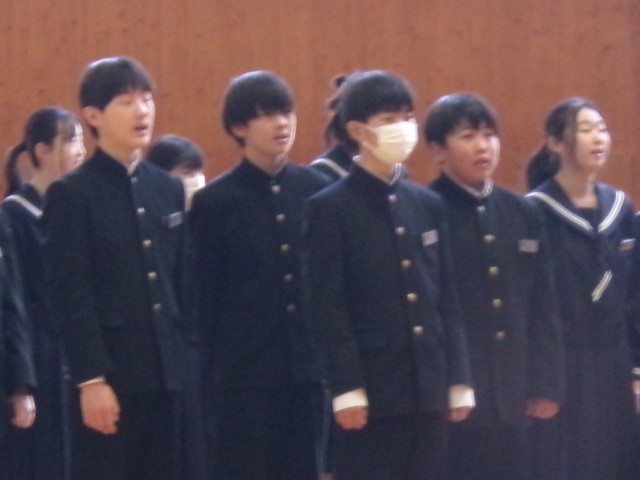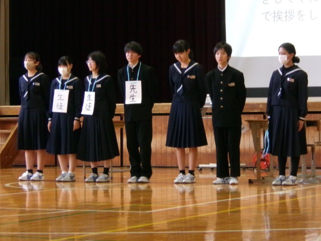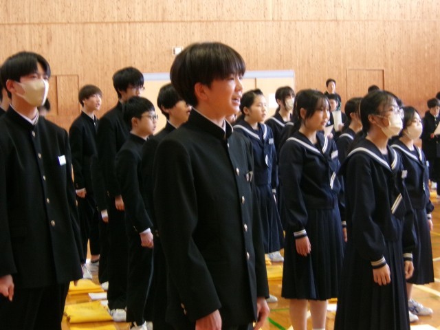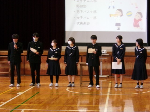 部活動の部長からは活動の紹介が行われ、興味津々で話を聞く新入生の姿が見られました。その後、青少年赤十字(JRC)への入会。最後は上級生による紹介を兼ねて校歌を吹奏楽部の演奏に合わせて歌いました。新入生代表によるお礼の言葉も立派でした。生徒会本部・専門委員長のみなさん、吹奏楽部のみなさん、準備から運営に関わった上級生のみなさん、ありがとうございました。