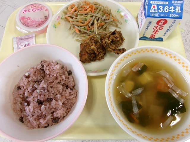 今日は入学・進級お祝い献立です。メニューは、お赤飯、ごま塩、牛乳、鶏肉のいそべ揚げ、ごぼうサラダ、お祝いすまし汁、さくらゼリーです。