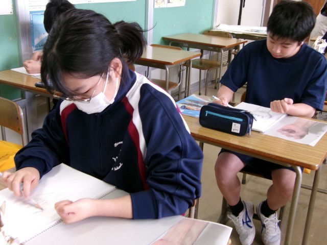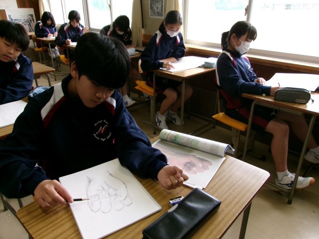 「デッサン」自分のこぶしを見ながら、指や腕の長さや影に気を付けて制作を進めています。