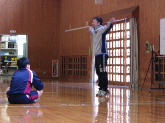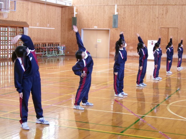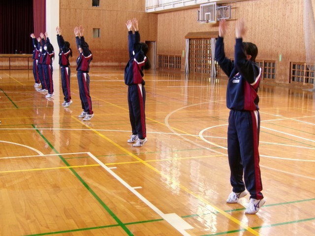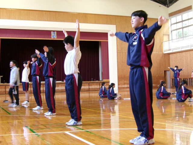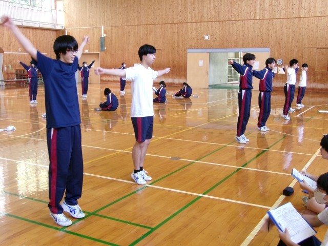 ラジオ体操の正しい動き、タイミングをペアで確認し合っています。