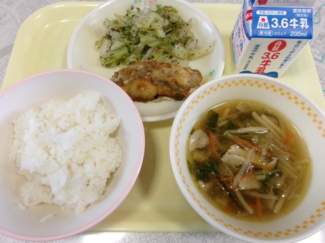 今日のメニューは、ごはん、牛乳、白身魚の薬味ソースがけ、キャベツのゆかり和え、さわにわんです。