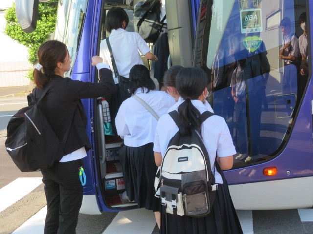 バスに乗車し、新富士駅に向かいます。朝のラッシュを避け、少し早く出発しました。先生方もお見送りに来てくださいました。