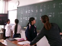 1年1組の数学の時間です。反比例の学習をしています。反比例と比例の数式の違いを確認して、練習問題に取り組んでいました。