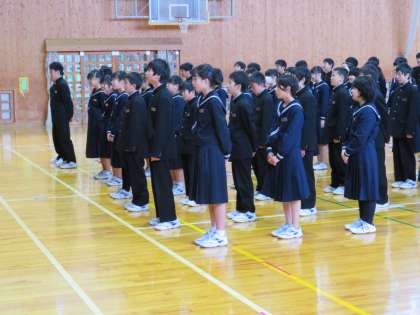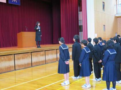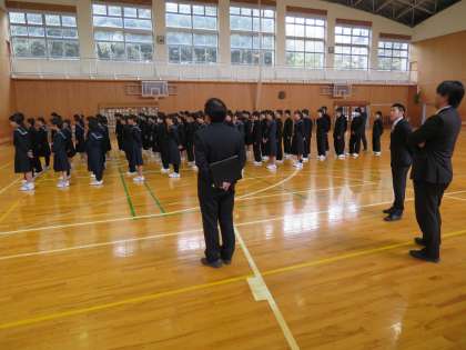 4月7日(金)、着任式に続いて、1学期始業式が行われました。校歌を歌いました。