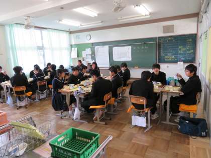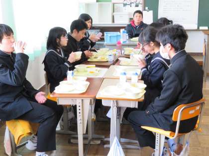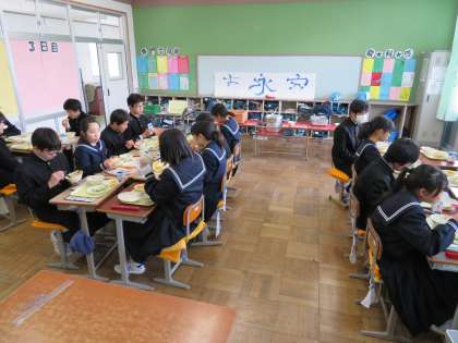3年生は、2クラスに分かれて人数が少なくなったためか、落ち着いた雰囲気の中で給食を食べていました。