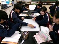 今日は2時間続きの授業で、調理実習を行っていました。廊下にはとてもいいにおいが…。メニューはシチューとカスタードプディングです。各班ごと協力して調理をしていました。