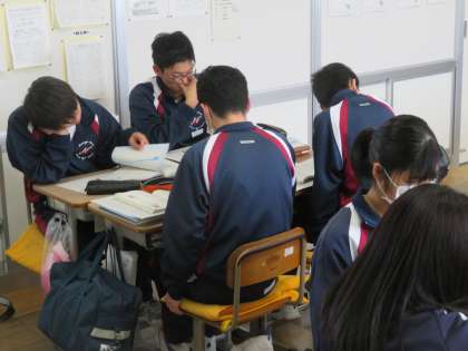 「ディズニーランドという聖地」という標論文を読み込む授業でした。難しい言葉も多く、筆者の表現の仕方をうまく評価できない生徒もいました。みんな真剣にとりくんでいました。最初は個人で考え、途中から班活動になりました。