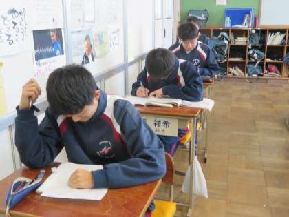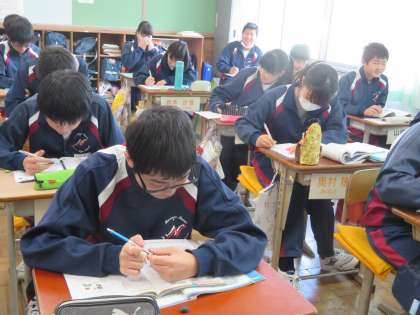 2月13日(水)、第6校時学活の授業の様子です。学年によって、随分内容が異なります。3年生は、中学校最後の定期テストである学年末テストにむけてテスト勉強をしていました。2年生は3年生にむけてと修学旅行の計画を、1年生は卓球大会を行っていました。