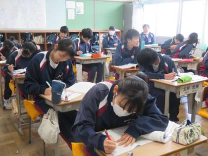 写真は、テスト勉強に励む1年2組の様子です。みんな真剣に取り組んでいます。
