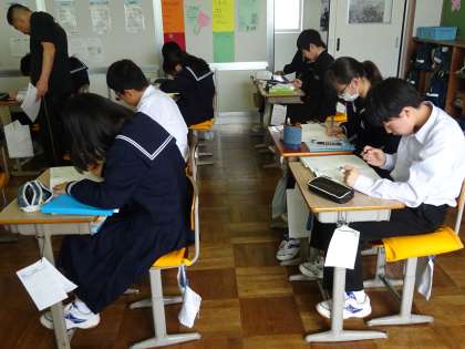 2年2組は数学、「文字式」の授業です。計算問題に熱心に取り組んでいます。