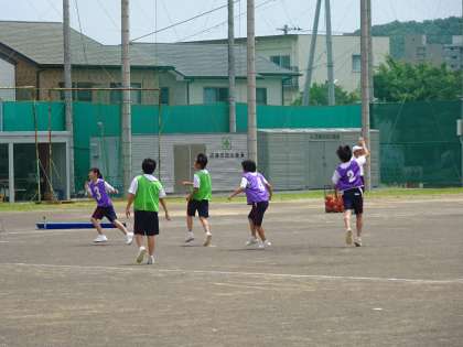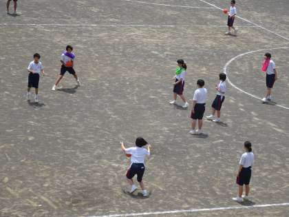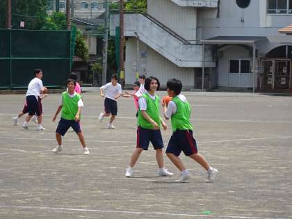 2年1組は体育、「ハンドボール」の授業です。ゲーム形式を何回か繰り返しています。
