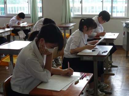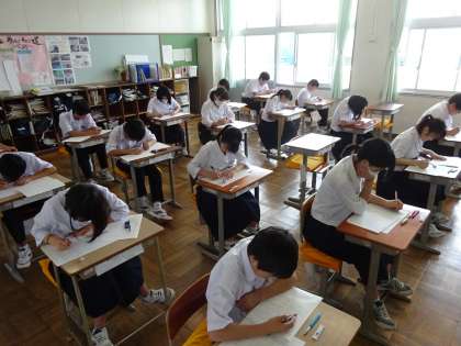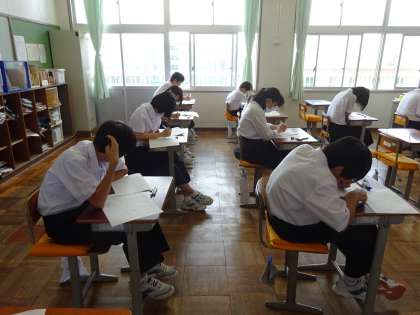 期末テスト1日目です。2年1組は1時間目、国語のテストでした。真剣に問題を解いていますね。