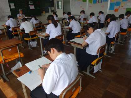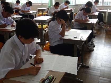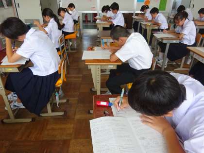 期末テスト2日目です。1年2組は国語のテストを受けています。問題をよく読んで解いていきましょう。