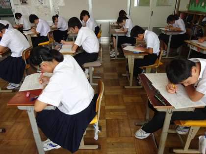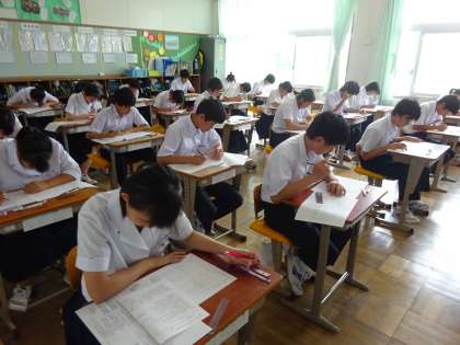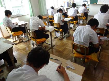 期末テスト2日目です。3年1組は理科のテストを受けています。真剣に取り組んでいます。
