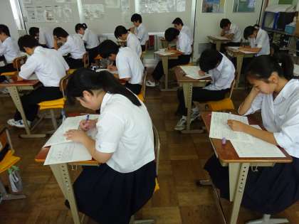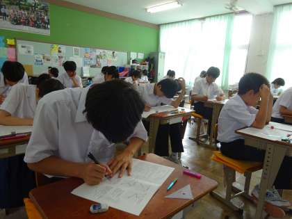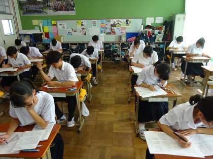 期末テスト2日目です。3年2組は理科のテストを受けています。真剣に取り組んでいます。