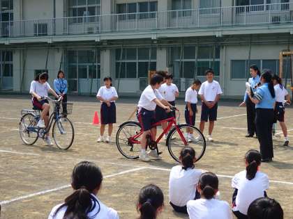 1年生は第6時に交通安全教室を実施しました。交通指導員の方々に来ていただき、自転車での安全な通行の仕方を学びました。