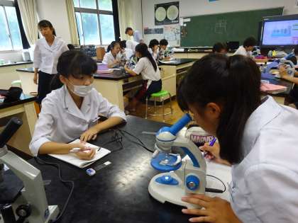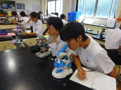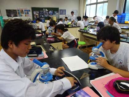 3年2組は理科、「細胞分裂」の授業です。顕微鏡で観察しています。上手に見えているでしょうか。