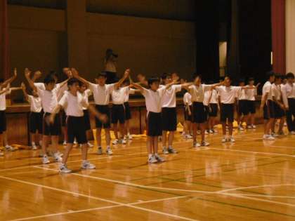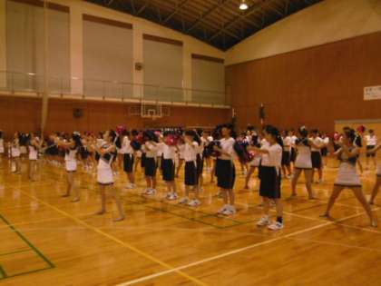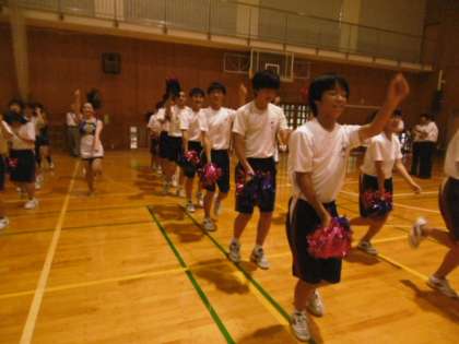 最後に音楽に合わせて、全員でチアと応援団の演技に挑戦しました。小学生、中学生、高校生が一体となって演技をしました。男子生徒のチアもなかなか素敵でした。