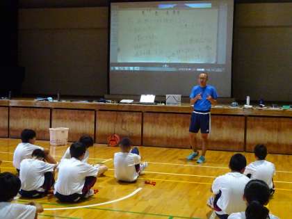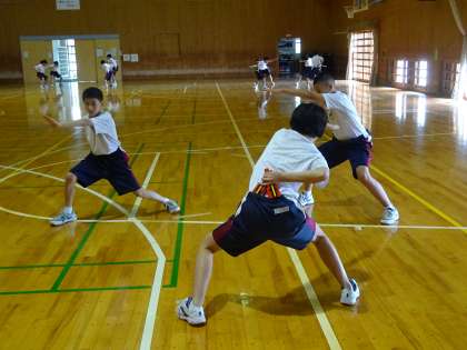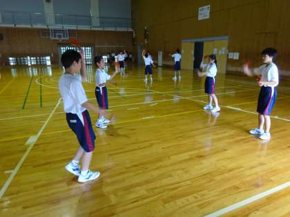 1年2組は体育の授業です。体育館でよさこいの振り付けを、スクリーンの映像を確認しながら覚えています。