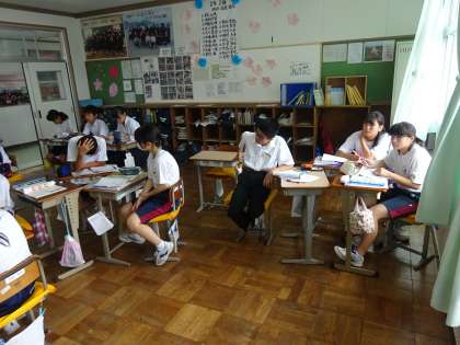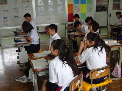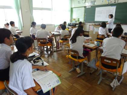 2年2組は英語、「My project4 スキット作りを楽しもう」の授業です。場面ごとの使い方を確認しています。