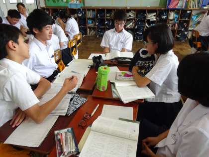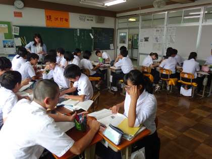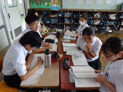 3年1組は国語の授業です。井伏鱒二の「黒い雨」が教材です。グループでの話し合いが活発ですね。