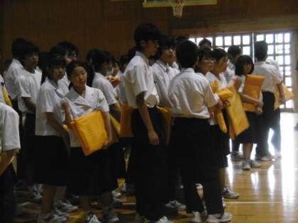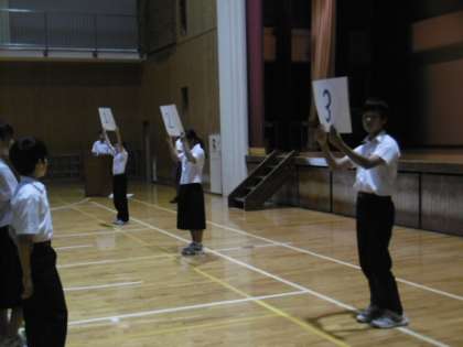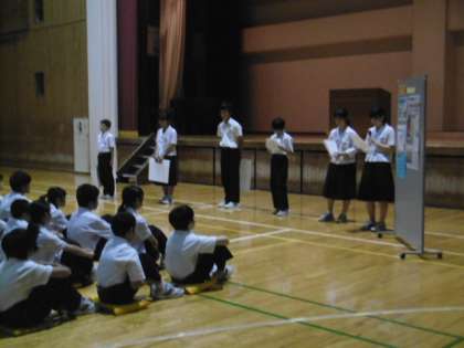 始めに、保健ボランティア委員会の発表がありました。熱中症対策についてのクイズが出題され、全校生徒が三択問題に挑戦しました。