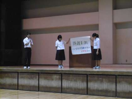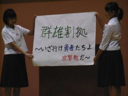 生徒会本部からは、松かげ祭のスローガン発表がありました。「群雄割拠〜いざゆけ勇者達よ 攻撃戦だ〜」が今年度のスローガンです。