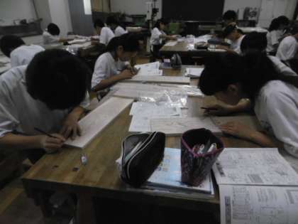 1年2組の技術の授業です。木材に寸法をとりながら木材に印をつけていました。これから自分が目指す作品に仕上げていきます。
