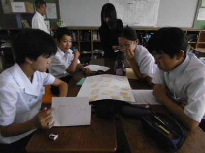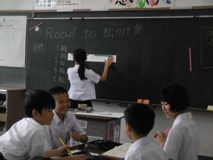 1年2組の学級活動の授業です。松かげ祭に向けてのクラスの目標と役割分担を決める話し合い活動を行っています。学級三役の進行のもと、活発な話し合いが行われていました。また、授業の終わりには、決めるべきこともしっかりと決まったようです。